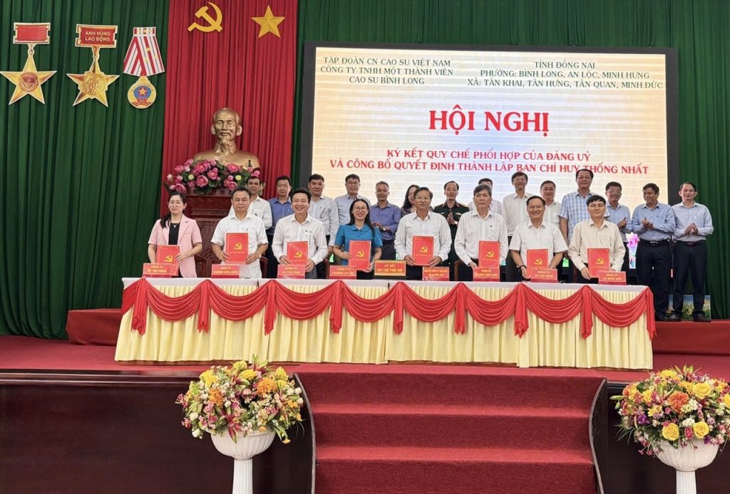 (ĐN) - Sáng 18-9, Đảng ủy Công ty TNHH MTV Cao su Bình Long phối hợp với Đảng ủy các xã, phường, tỉnh Đồng Nai trên địa bàn công ty đóng chân tổ chức hội nghị ký kết quy chế phối hợp và công bố quyết định thành lập Ban Chỉ huy thống nhất giữa các đơn vị.